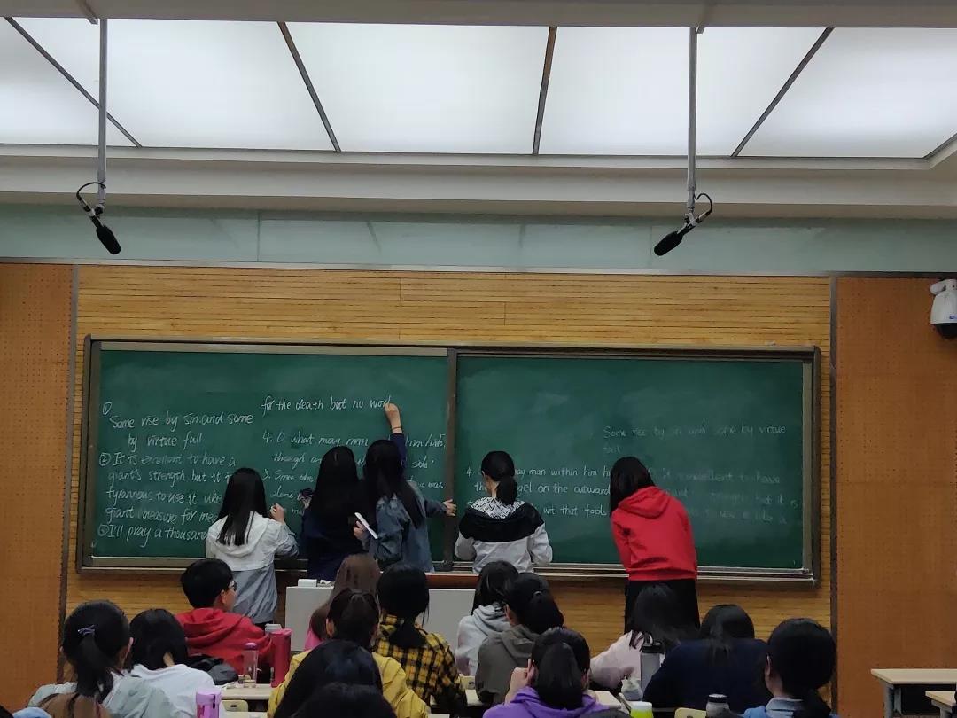 第一部分是粉笔字书写比赛,要求参赛同学在三分钟之内书写出所给的三个英文句子。参数选手全神贯注地在黑板上书写,一笔一划,无不展示出深厚的书写功底。经过评委的评选,刘梦妮同学获得一等奖;赵奕丹同学获得二等奖;贺琬蓉同学和白翠娥同学获得三等奖。活动的第二部分是硬笔书写比赛。经过评比,任雨欣和刘睿同学获得一等奖;廖家祺、史玉倩和马瑞霞同学获得二等奖;严金棠、叶露露、丁转龙、孙君岳、杨双毓和胡航洋同学获得三等奖。