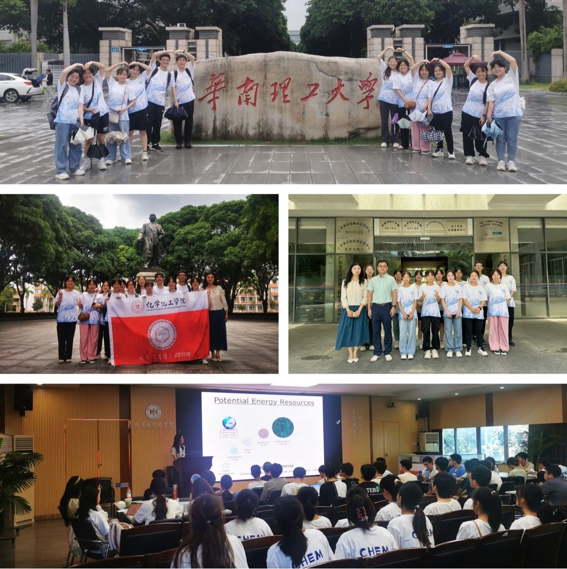 交流学习。大家首先旁听了学院强基班及拔尖班的暑期国际化课程——来自爱丁堡大学的Hu Yue老师为大家讲述了光伏电池的基础理论课程,提升了同学们的专业英语水平。随后化工学院副院长余皓教授、化学工程系副主任周欣副教授、行政人员陈敏红老师,实验教师阮涛老师、孙昭老师等人与同学们进行了亲切交流。余皓副院长对同学们到来表示热烈欢迎,周欣老师对学院拔尖创新人才培养体系进行了介绍,陈敏红老师对研究生招生政策进行了解读,阮涛老师带领同学们对学院实验室及公共测试平台进行参观。午餐后,同学们参观了华南理工大学及其校史馆,通过充满数字化的史馆学习了解了华南理工大学的发展历史及其校友成就。