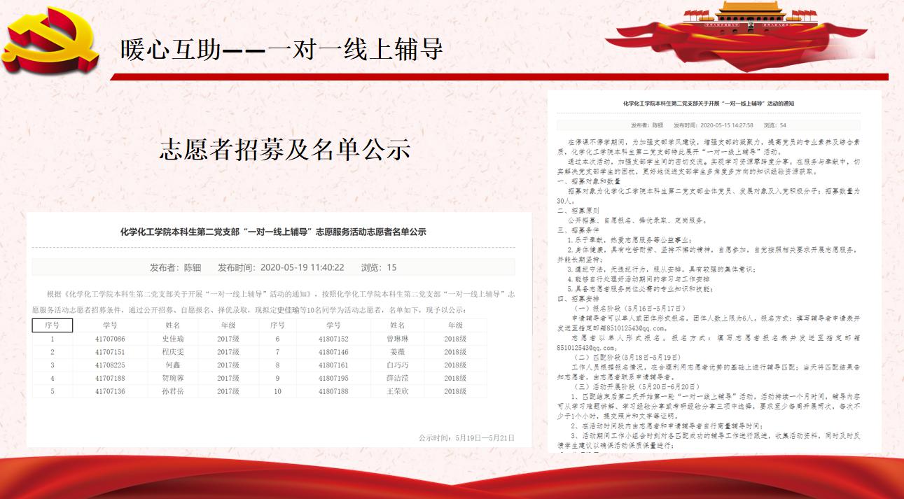 5月15日-5月20日,通过公开招募、自愿报名的方式,择优录取了10名志愿者,并对志愿者名单进行了公示。