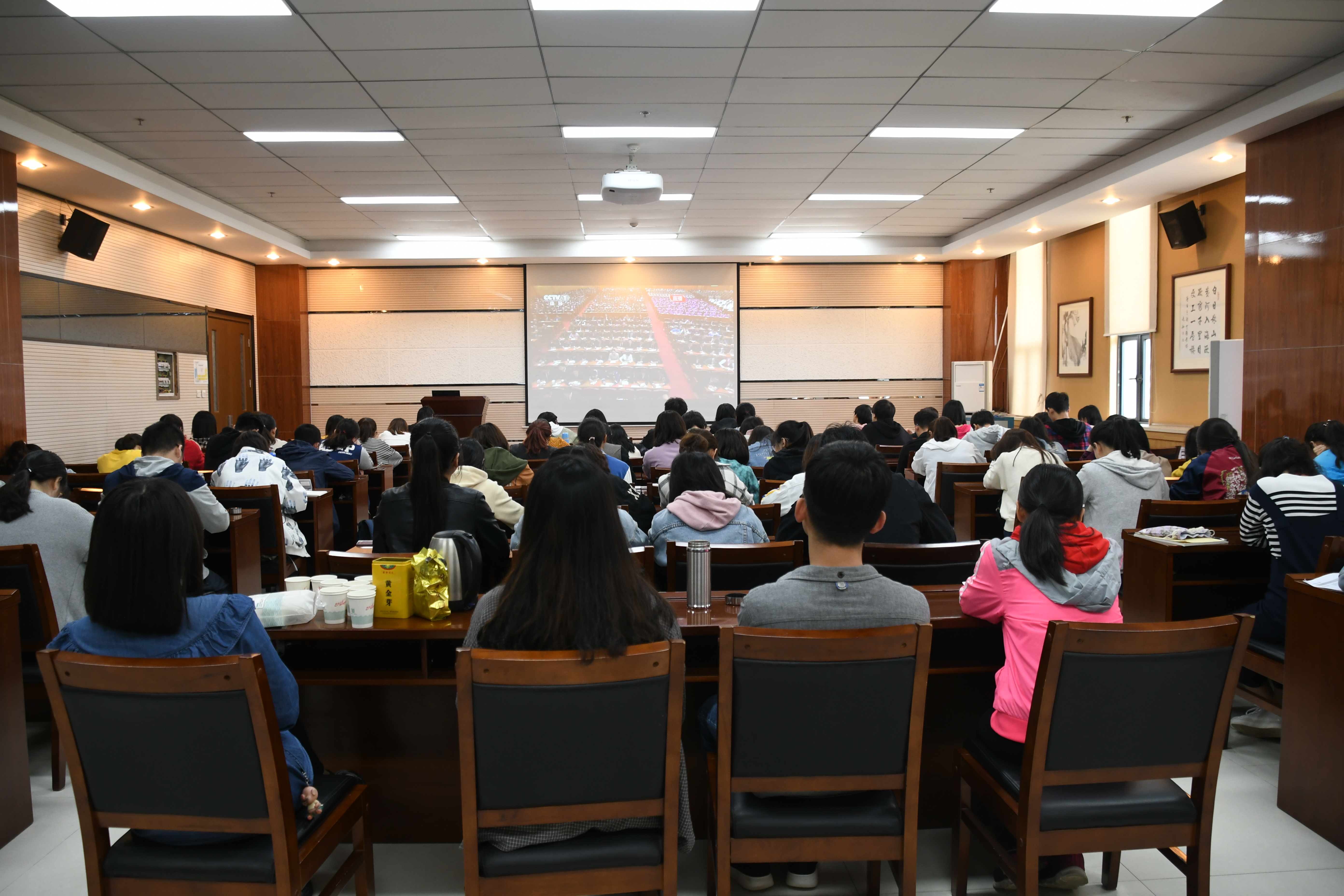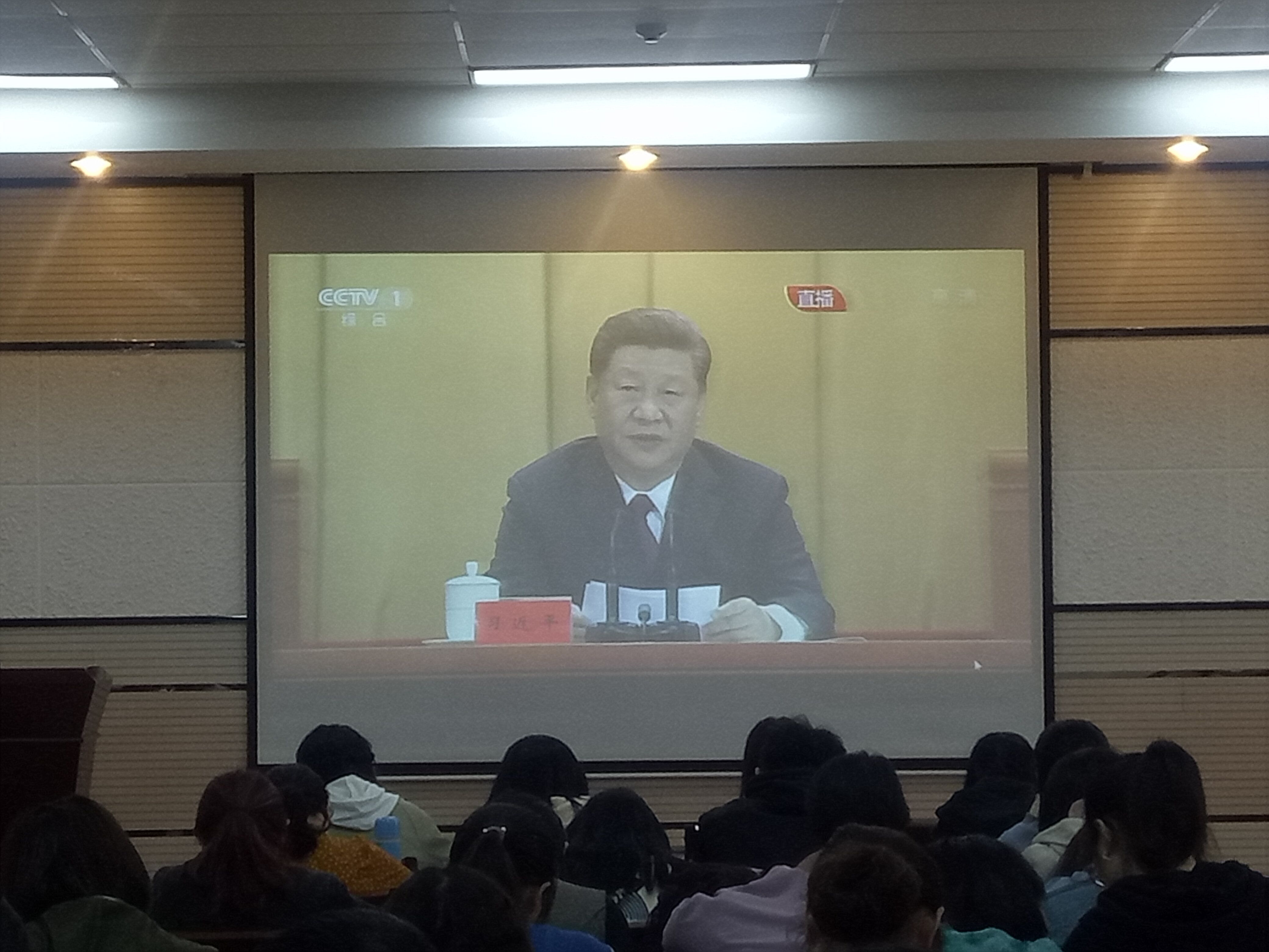 团委组织班级团干部、学生干部、党支部代表在致知楼1668会议室收听收看大会实况。学院团委书记陈钿老师,2015级辅导员谢遵园老师,2016级辅导员牟朝丽老师,2017级辅导员龙卓华老师,2018级辅导员翁思洁老师一同观看此次大会。