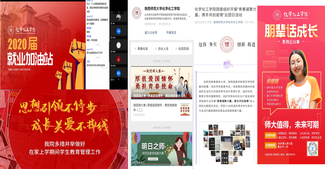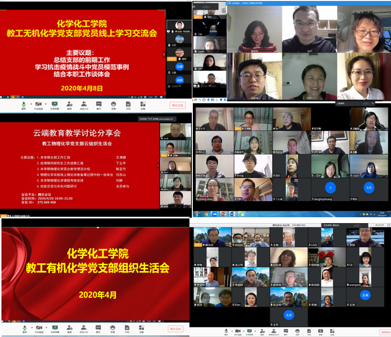 教学经验交流,助推教学质量提升。疫情防控期间,各教师党支部围绕在线教学工作开展视频会议研讨交流。2020年4月,教工无机化学党支部党员围绕线上教学设计、教学互动、虚拟仿真实验教学和线上实验教学的操作方法、无机化学教学丛书编写等进行了交流研讨。教工分析党支部党员结合线上教学实践经验和虚拟实验教学探索进行交流。教工有机化学党支部开展的组织生活会,将学习、讨论扩大到整个教研室。与会教师主要从教学进度、本科毕业论文指导情况以及实验教学的开展进行了交流讨论。教工物理化学党支部教师分享了开展线上教学和辅助教学的经验,重点讨论了如何调动学生在线学习积极性、如何开展教学评价、复学后如何进行线上线下教学衔接等问题。