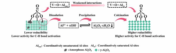 钒氧化物的还原性能调控及其高效活化乙苯及丙烷C-H键的研究(Angew. Chem. Int. Ed., 2023, 62, e202310062):如下图所示,基于溶解-沉积平衡原理,开发了一种普适性的氨水后处理策略,成功实现了负载型金属氧化物还原性能的精准调控。通过该方法制备的VOx-Al2O3催化剂在CO2氧化乙苯脱氢和丙烷脱氢反应中表现出优异的催化性能。结合原位紫外-可见漫反射光谱、瞬态产物分析等表征技术,揭示了VOx还原性能与其催化乙苯及丙烷C-H键活性之间的构效关系,并证实了H2生成是丙烷脱氢反应的速控步骤。该研究为理解金属氧化物催化剂的构效关系提供了新的视角。