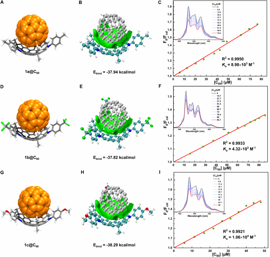 图6 1a, 1b和1c对富勒烯C60的超分子识别