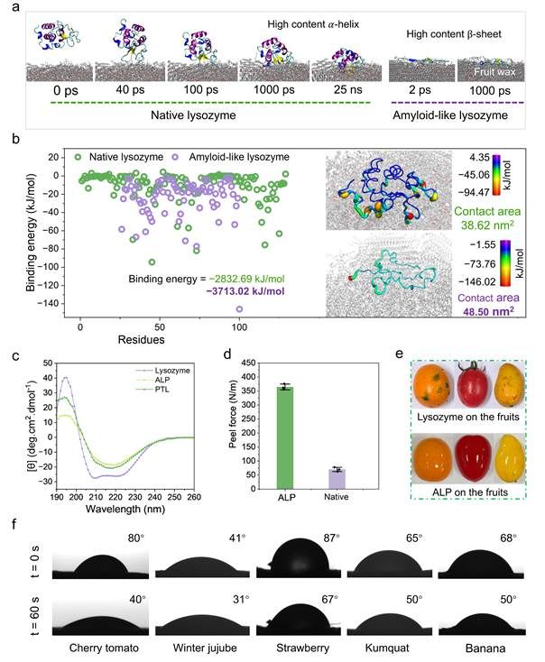 这项研究工作中的核心在于利用相转变溶菌酶(PTL)作为“智能粘合剂”,如图1展示了ALP涂层的制备过程及其水果保鲜机制:PTL作为粘附层与果实表皮蜡质结合,协同SA和CNC形成蛋白质屏障。该复合涂层通过增强粘附稳定性、机械强度、水氧阻隔性、抗菌及抗氧化能力,显著延长水果货架期。涂层同时具备可清洗、可食用、低成本、低碳排放特性,并适用于多种水果的普适性保鲜。作者通过计算机辅助分子动力学模拟,深入探究了溶菌酶及相转变溶菌酶与水果表皮蜡质层的界面相互作用(图2)。模拟结果显示,淀粉样溶菌酶能快速(2皮秒内)在疏水蜡质层表面铺展,并在1纳秒内实现完全粘附,其界面接触面积比天然溶菌酶增加26%,结合能提升31%。这种强效粘附解决了保鲜涂层在复杂水果表皮上难以均匀附着和持久稳定的关键难题。