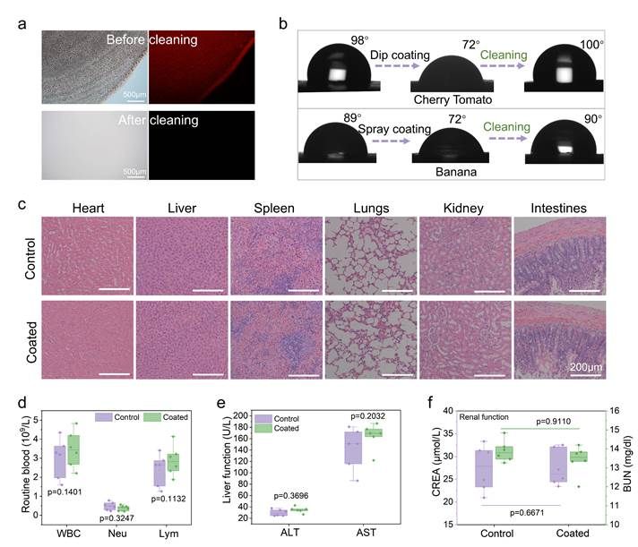 结果还表明水洗可完全清除水果表面的涂层残留,接触角测试进一步证实番茄/香蕉表面疏水性恢复至未处理状态。进一步将ALP涂层喷涂到大鼠食物上,并根据GB 15193.22-2014标准进行28天经口毒性试验。在整个观察期间,食物和水的消耗量没有显着差异,两组之间的体重变化也没有显着差异。在28天的实验后收集器官和血液样本用于病理检查、常规血液检查以及肝肾功能评估,病理切片未观察到病理改变,ALP治疗组与对照组之间无明显差异。同时,常规血液检查和肝肾功能检查的结果在正常范围内。这些结果证明了ALP涂层的良好生物安全性,并保证了其食用安全性。此外,进行全面的生命周期评估(LCA),以评估ALP涂层作为水果保鲜方法的环境影响和可持续性。LCA分析显示,ALP保鲜的碳排放仅为冰箱冷藏保鲜的是十分之一,为替代高耗能冷链提供了可持续解决方案。