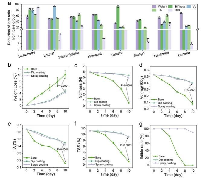 然后验证了ALP涂层对各种类型的易腐水果的保鲜效果,包括非呼吸跃变型水果和和呼吸跃变型水果。在非呼吸跃变型水果中,ALP涂层使草莓货架期从4天延至10天(2.5倍),枇杷从4天至16天(4倍),冬枣从12天至21天(1.75倍),金桔从15天至30天(2倍);在呼吸跃变型水果中,番茄从6天延至16天(2.7倍),芒果、油桃、香蕉均从2天延至8天(4倍),无花果从1天至3天(3倍),枸杞从1天至5天(5倍)。感官评价通过电子鼻/舌雷达图与线性判别分析(LDA)证实,涂层保鲜的水果在整个贮藏期保持与鲜果相近的香气和风味特征,而对照组在存储末期风味显著劣变。该涂层在37°C/42°C高温下仍有效延长芒果/草莓货架期3-4天,凸显其环境适应性。此外,作者分析了水果储存期间的失重率,硬度,Vc含量,可滴定酸含量和可溶性固形物含量,结果表明ALP涂层在储存期结束时将重量损失减少了33-69%,硬度损失降低了9%-91%,Vc含量的损失减少了14%-92%,TA的含量可有效减少21-65%的损失,TSS的含量损失减少了2-89%。