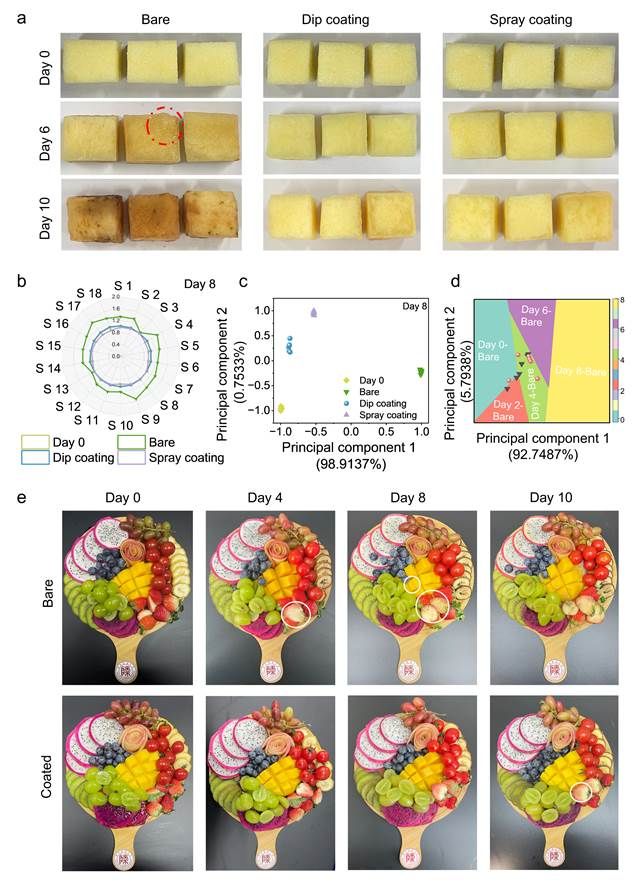 在鲜切苹果模型中,涂层处理使贮藏10天后的鲜切苹果的失重率减少88%,Vc等营养保留率57%-86%,而未处理组只有8%-39%。电子鼻/舌结合线性判别分析(LDA)显示,贮藏末期ALP处理组的香气/风味特征与鲜果初始状态相近,而对照组严重劣变。此外作者还通过水果拼盘的保鲜进一步验证了ALP的保鲜普适性,可以延长水果拼盘4倍货架期。综上所述,ALP涂层有效地保留了鲜切水果的风味和营养品质,凸显了其在水果保鲜技术方面的巨大潜力。