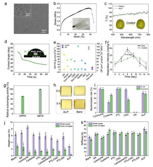 作者对ALP涂层的性能进行表征,通过扫描电镜与力学测试确认涂层具备致密微观结构(厚度约20μm)及优异机械性能,断裂伸长率达到39%,在水果储存过程中可以抵抗过早失效或开裂;紫外光谱验证其高透光性(>80%),保持水果自然外观。为了进一步了解ALP涂层的保鲜特性,作者测试了涂层水蒸气透过率和氧气透过率,结果表明ALP涂层保持最佳水蒸气和氧气阻隔性能,为延缓水分蒸发和水果呼吸速率提供保障。同时,该涂层还具有优异的抗菌活性和抗氧化性能。