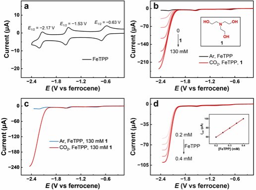 图2(a)氩气条件下0.5 mM FeTPP在DMF中的循环伏安曲线。(b)二氧化碳条件下0.5 mM FeTPP随1浓度增加的线性循环伏安曲线图。(c)氩气和二氧化碳条件下0.5 mM FeTPP加入130 mM 1的线性循环伏安曲线对比图。(d)二氧化碳条件下加入100 mM 1时,催化电流随FeTPP浓度增加的线性循环伏安曲线图。