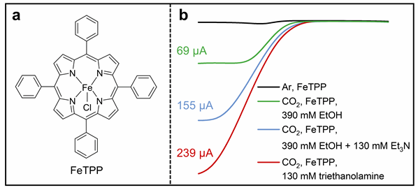 图1(a)FeTPP的分子结构。(b)加入不同质子源后FeTPP的CO2RR活性示意图。
