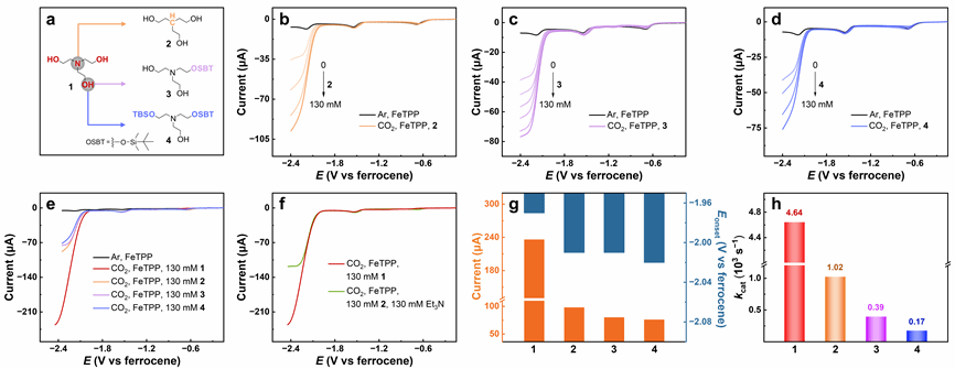 图4(a)2、3和4的分子结构。二氧化碳条件下0.5 mM FeTPP随(b)2、(c)3和(d)4浓度增加的线性循环伏安曲线图。(e)二氧化碳条件下加入130 mM 1、2、3和4时0.5 mM FeTPP的线性循环伏安曲线对比图。(f)130 mM质子源1与130 mM质子源2和130 mM Et3N同时存在时0.5 mM FeTPP线性循环伏安曲线对比图。(g)加入130 mM 1、2、3和4时催化电流与起峰电位的对比图。(h)0.5 mM FeTPP加入1、2、3和4之后的催化速率常数对比图。