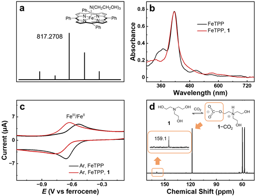 图3(a)FeTPP加入1之后的高分辨质谱图。(b)加入1前后的紫外可见光谱图和(c)FeIII/II电对的循环伏安曲线图。(d)1和CO2反应的核磁碳谱图。