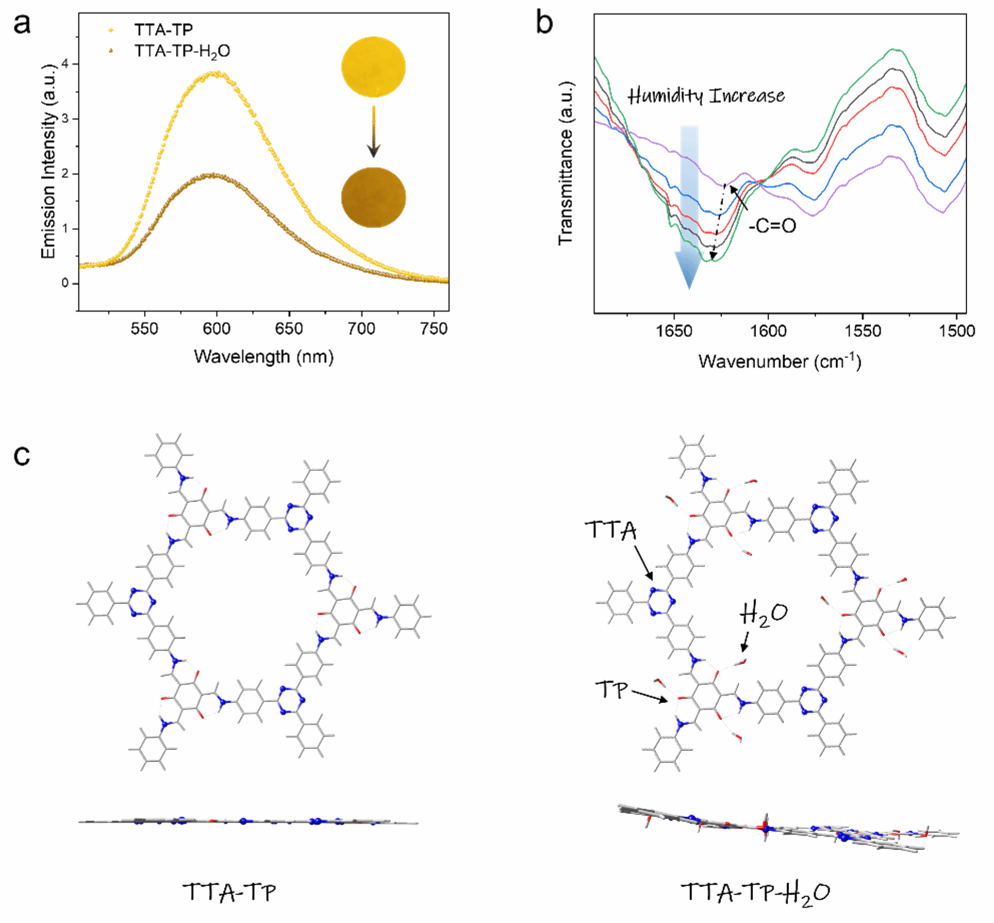 作者对该薄膜的湿度响应机理进行了研究(图5),红外光谱研究表明膜内的亲水羰基结构会与水分子形成氢键,理论计算发现氢键的形成使得COF膜结构由平面变为扭曲,降低了其吸收和荧光发射强度。
