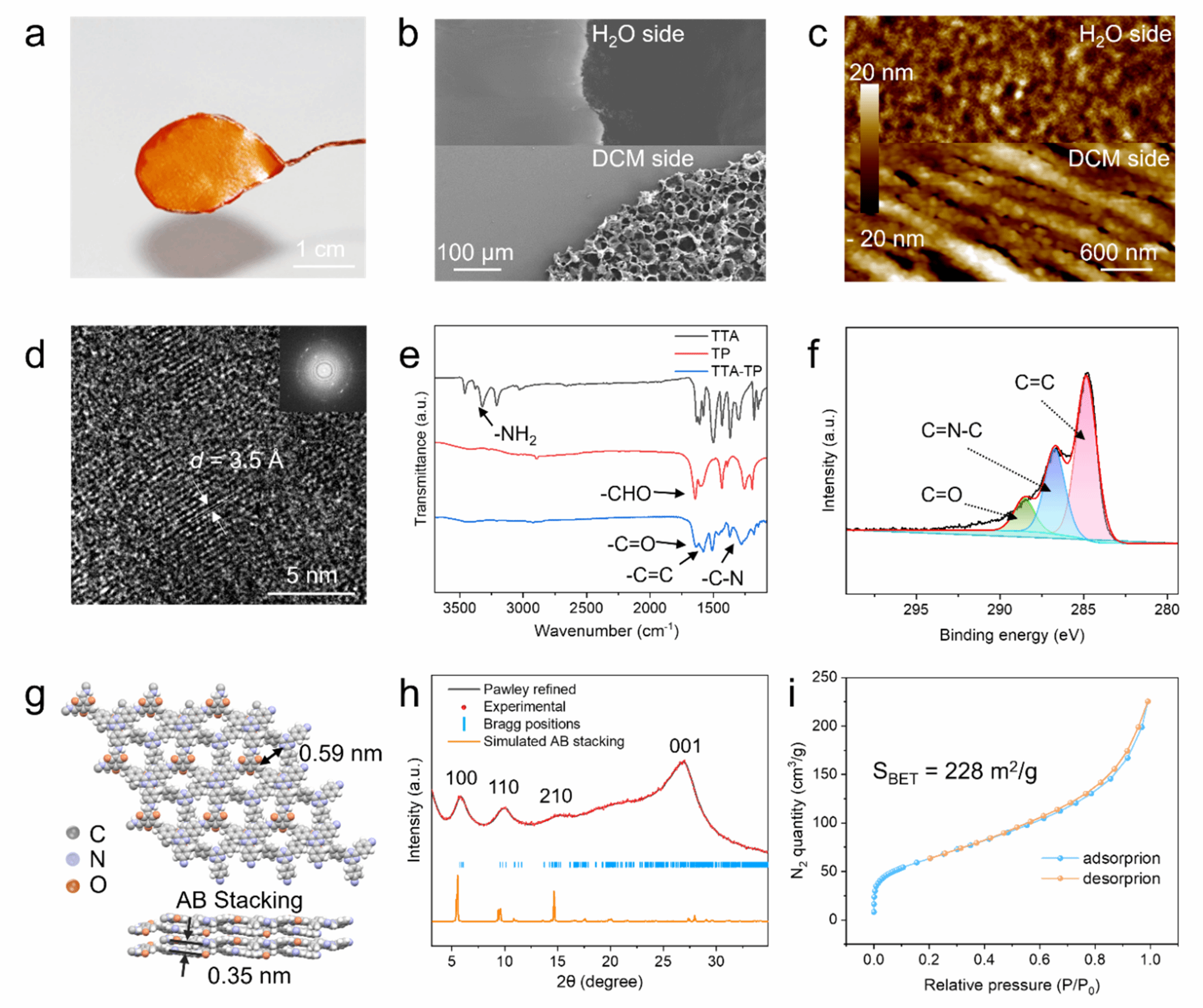 图 2. TTA-TP COF 膜的照片、形貌和结构表征