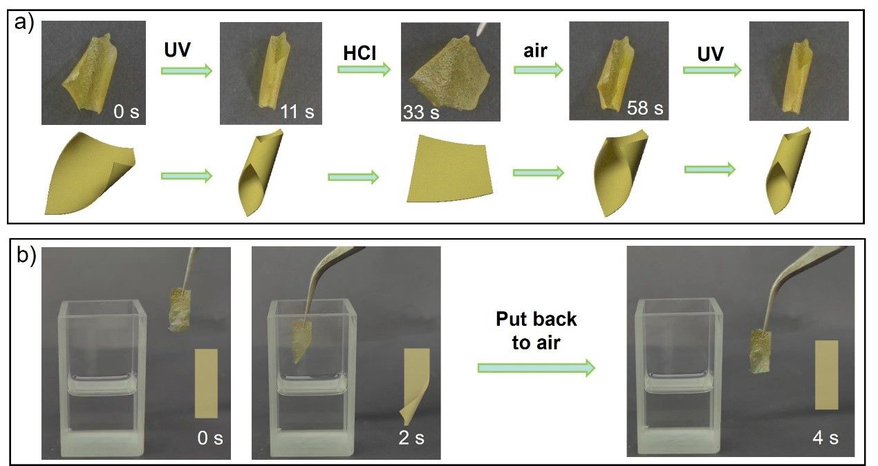得到的薄膜的厚度可灵活调整,其面积可延展至50 cm2。尤为引人注目的是,它在紫外光的刺激下能够迅速发生卷曲或弯曲运动,其响应时间可短至0.1秒以内,其响应速度超过了一众晶态材料。而一旦置于盐酸蒸气环境中,它又能迅速恢复原有的形状。此外,该薄膜还能对特定有机蒸气作出响应,发生卷曲运动,而当转移至空气中时,又能迅速回复至平直状态。这一系列出色的光/气体致动性能使得该薄膜在人造肌肉、软体机器人、微流控系统等多个领域展现出无比巨大的应用潜力。