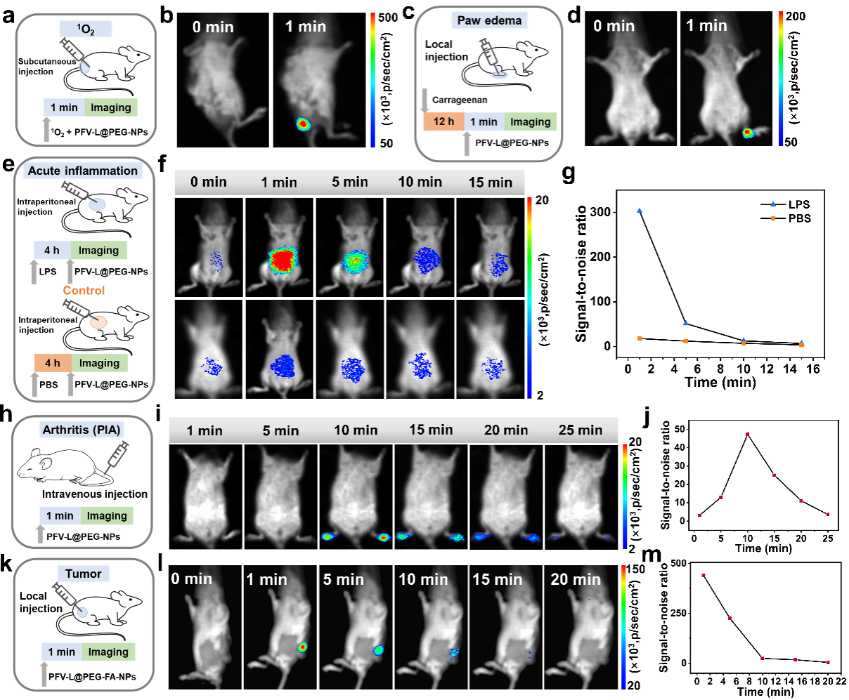 此外,为了更好地应用在活体原位炎症成像及肿瘤治疗中,该课题组通过将PFV-Luminol和两亲性共聚物DSPE-PEG/DSPE-PEG-FA自组装构建了纳米粒子PFV-L@PEG-NPs和PFV-L@PEG-FA-NPs。研究表明,PFV-L@PEG-NPs在大鼠关节炎、小鼠急性腹腔炎和爪水肿炎症模型上均呈现了良好的化学发光成像效果,而PFV-L@PEG-FA-NPs可以在无激发光源的条件下实现活体肿瘤的化学发光成像和光动力治疗。该研究工作为化学发光探针的设计及其在疾病的诊断和治疗方面提供了新的思路。