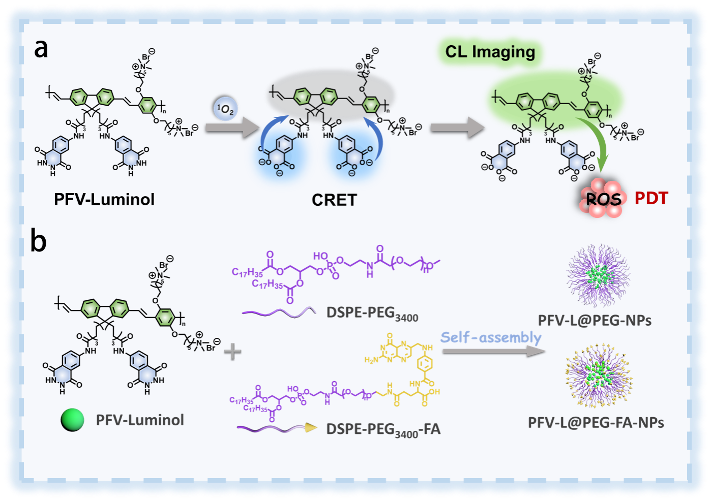图1. PFV-Luminol的化学发光机理及纳米粒子制备示意图。