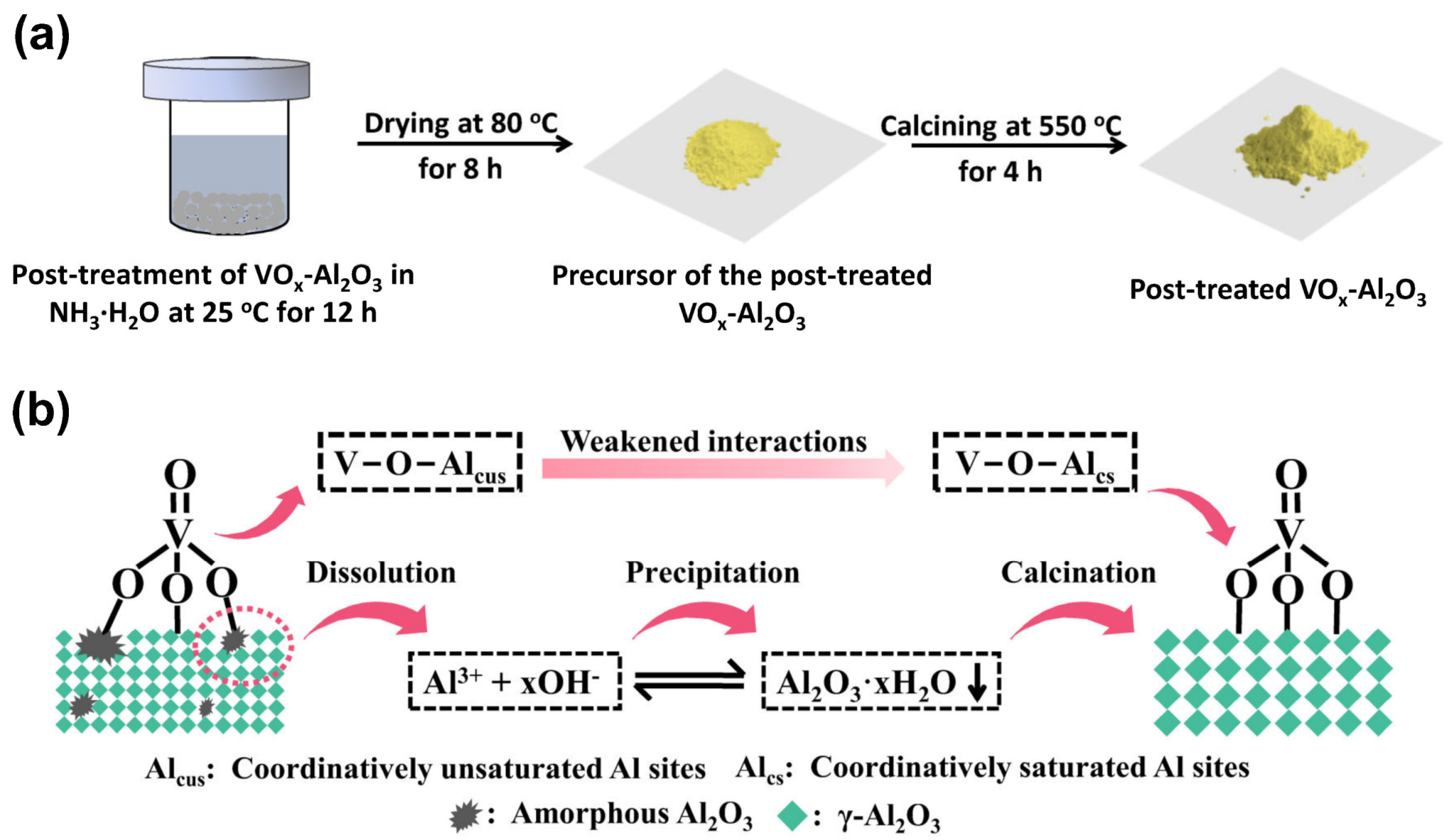VOx-Al2O3催化剂的碱性水溶液处理方法(a)及原理(b)示意图