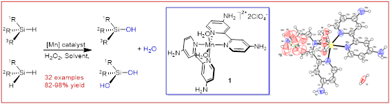 硅醇是构建材料分子重要组成单元,重要化工原料,有机合成中间体,药物分子单元,以及有机催化剂。截至目前,已发展了使用铑、钌、钯、金、银、钛、钨、等催化氧化反应,实现对硅氢键氧化合成硅醇反应,但在反应选择性上不可避免地形成硅醚产物。高锰酸钾常常被当作氧化剂用于碳氢键、碳碳双键、等氧化反应,使用高锰酸钾也可以实现对硅氢键氧化合成硅醇,但反应需要剂量高锰酸钾,反应中会产生当量二氧化锰废弃物,并且底物有很大局限性。由于锰是一个金属锰是一个廉价、毒性较低金属。 近年来,有机化学家发展了血红素、非血红素结构类卟啉锰催化剂,用于碳氢键氧化,但没有含锰的催化剂用于硅氢键氧化合成硅醇的报道。