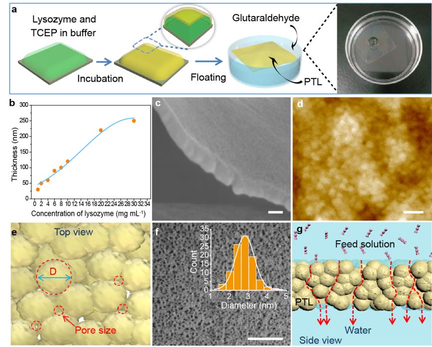 杨鹏课题组先前曾报导过由二硫键还原剂Tris(2-carboxyethyl)phosphine (TCEP)快速打开溶菌酶分子内的二硫键而解锁α-螺旋结构,诱导其向更加低能量的β-sheet自发转变而组装成的相转变溶菌酶(phase-transited lysozyme,PTL)纳米薄膜,聚集条件温和可控、速度快、材料和过程成本极大降低(Adv. Mater. 2016, 28, 7414;Biomater. Sci. 2018, 6, 836)。该膜表现出优异的生物相容性、高的界面粘附稳定性、丰富的界面功能基团和组装形态(Adv. Mater. 2016, 28, 579;Angew. Chem. Int. Ed. 2017, 56, 9331;Angew. Chem. Int. Ed. 2017, 56, 13440;Adv. Mater. 2018, 30, 1802851;Adv. Mater. 2018, 1803377;Adv. Funct. Mater. 2017, 28, 1704476; ACS Appl. Mater. Interfaces 2017, 9, 198),从而有望将其应用于分离膜领域。在以上研究基础上,进一步的研究发现将该蛋白质基纳米膜用戊二醛交联后可用作透析和超滤膜分离。该膜是由蛋白质淀粉样转变前期形成的纳米级球状寡聚体在气液界面聚集而成,而不同寡聚体小球相互聚集之间的缝隙为高效分子和胶体分离提供了天然的纳米孔道。膜厚度和孔道直径可通过改变蛋白质的浓度来调控(图1)。