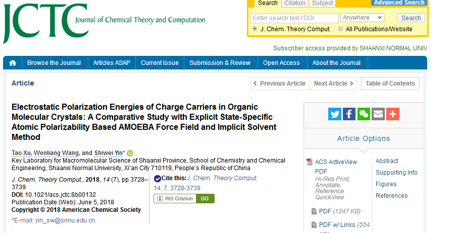 该论文发表在理论与计算化学领域重要期刊J. Chem. Theory Comput.,论文第一作者为2015级博士生徐涛,由王文亮教授和尹世伟教授指导完成。该工作得到了国家科技部重点研发项目(2017YFB0203404),国家自然科学基金(21173138),以及111项目(B14041)的大力支持。