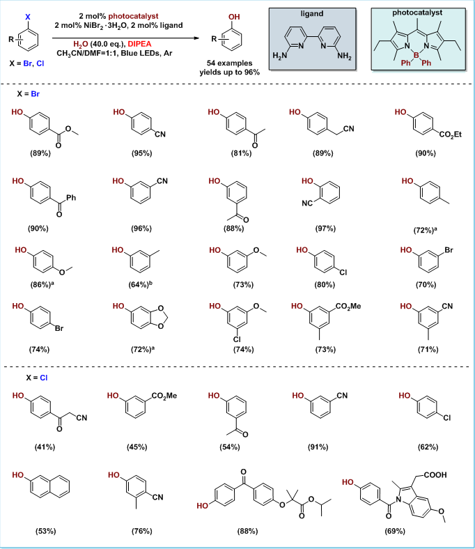 酚类化合物是一类非常重要的有机合成中间体,广泛存在于农药、医药、材料、天然产物当中。如何高效的合成此类化合物一直是有机合成研究当中的热点问题之一。目前,合成酚类化合物主要是以金属钯、铜作为催化剂,强碱作为羟基源,对卤代芳烃进行羟基化反应。但此类合成方法对于一些含有碱性敏感官能团的底物是无法实现。发展更高效的方法,廉价的催化剂以及合适的羟基源对卤代芳烃进行羟基化反应仍然是一个十分重要的研究课题。针对此类问题,捷克论坛