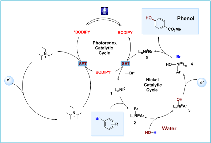 “绿色催化与合成研究团队”薛东课题组采用廉价易得的有机染料(BODIPY)作为光敏剂,以二价金属镍为催化剂,在可见光的照射下,实现了以水作为羟基源的卤代芳烃羟基化反应。该方法有着非常广泛的底物适用范围,以及良好的官能团兼容性。不仅适用于一些活性较高的溴代芳烃,也适用于一些活性较低的氯代芳烃,以及复杂的药物分子。克服了金属钯或铜作为催化剂,利用强碱作为或产生羟基源的难题。机理的研究表明:可见光及光敏剂是不可或缺的,对于反应体系中镍催化剂的循环起到了至关重要的作用,该体系中瞬态的Ni(III)物种是经由光催化循环氧化Ni(II)物种得到的。这些前期的工作表明:镍(II)-氟硼二吡咯烷可见光协同催化偶联反应的研究不仅仅是用镍替换传统的钯和铜催化剂开展重要偶联反应的研究,更重要的是为克服传统偶联反应存在的一些问题,进而为发展基于氟硼二吡咯类光敏剂的新型催化体系、开展特色光催化反应的研究和发展新的合成方法学建立了研究基础。该研究工作 “Synthesis of Phenols: Organophotoredox/Ni Dual Catalytic Hydroxylation of Aryl Halides with Water”发表在国际学术期刊《德国应用化学》(Angew. Chem., Int. Ed. 2018, 57, 1968.)上。该研究工作第一作者为2015级硕士研究生杨柳。