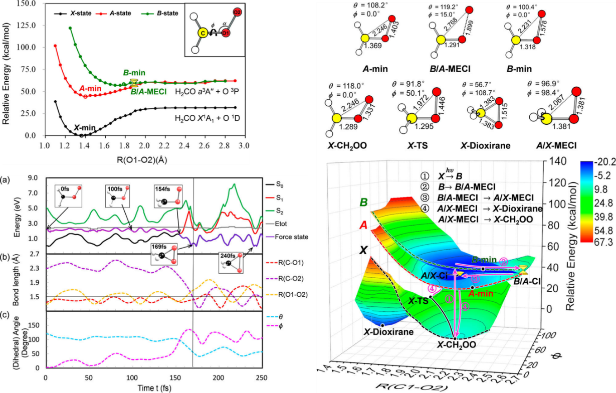 理论与计算化学团队采用多组态电子结构计算和面跃迁分子动力学,发现了最简单Criegee中间体的一个由A1A暗态参与的、异构化为环状双环氧乙烷(dioxirane)的可能光异构化途径。由B1A→A1A内转换得到或由选态激发获得的A1A态简单Criegee中间体分子,在面外旋转模式驱动下可经由A/X1A态间的势能面交叉(A/X1A-MECI),无辐射跃迁回基态,进而生成能量更稳定的双环氧乙烷。动力学计算表明,A1A态的激发态寿命为138 fs,而生成双环氧乙烷的时间为约254 fs。A1A→X1A 光异构化途径的发现不仅丰富了Criegee中间体的机理,而且可为其选态化学研究提供理论指导。