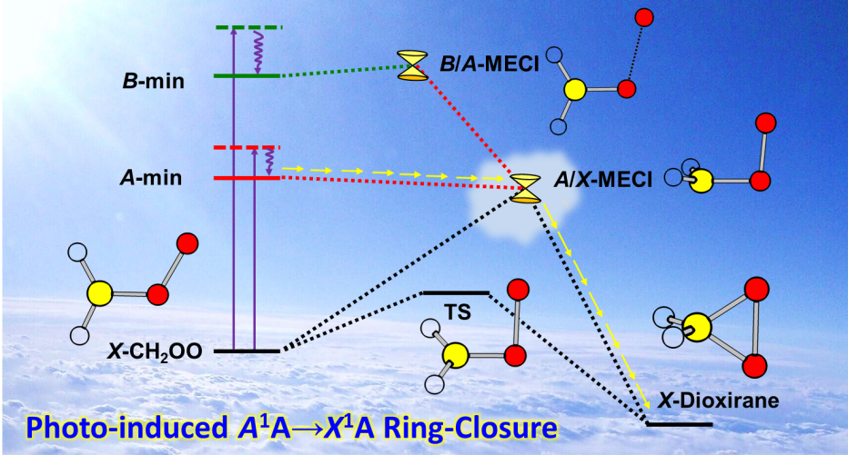 Criegee中间体(CR2OO)是大气中一种重要的活性中间体,它广泛地参与大气中的单分子和双分子反应,生成多种亚稳态物种(如OH, HCHO和1O2等),因而在大气循环和环境污染及控制中具有重要地位。Criegee中间体参与的反应一直以来都是是实验和理论研究的热点之一。由于Criegee中间体存在于大气对流层当中,日间受到充足的阳光照射,这使得其光物理和光化学过程具有十分重要的意义。目前,Criegee中间体的光化学反应(如O-O键或C-O键的断裂)过程已有实验和理论报道。此前理论研究发现,最简单Criegee中间体(CH2OO)在被激发到B1A′态后通过两个自旋禁阻的反应通道(即H2CO X1A1 + O 1D 和 H2CO a3A″+ O 3P)实现O-O键断裂的反应趋势。
