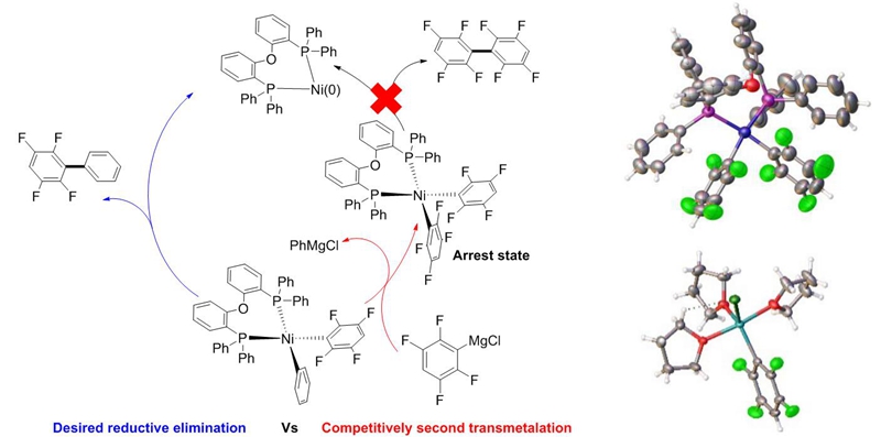得益于氟原子的“负氟效应”,他们成功地分离得到催化剂的终止态,机理研究表明,该化合物来源于体系中过量格氏试剂对二价镍复合物中间体的竞争性二次转移金属化(芳基交换)。这是Kumada偶联反应问世近50年来首次证实这种类型的芳基交换存在。对于非氟代芳基格氏试剂参与的Kumada偶联,二次转移金属化极可能是格氏试剂自身偶联副产物产生的主要途径。目前,自身偶联副产物污染仍然是影响Kumada偶联应用于工业化生产的主要原因之一。黄治炎老师课题组的研究结果为设计新的催化体系抑制自身偶联反应,减少副产物生成具有重大的指导意义。该系统性的研究工作以全文形式发表在《ACS Catalysis》,第一作者是2014级硕士研究生王俊亚(//pubs.acs.org/doi/pdf/10.1021/acscatal.7b02618)。