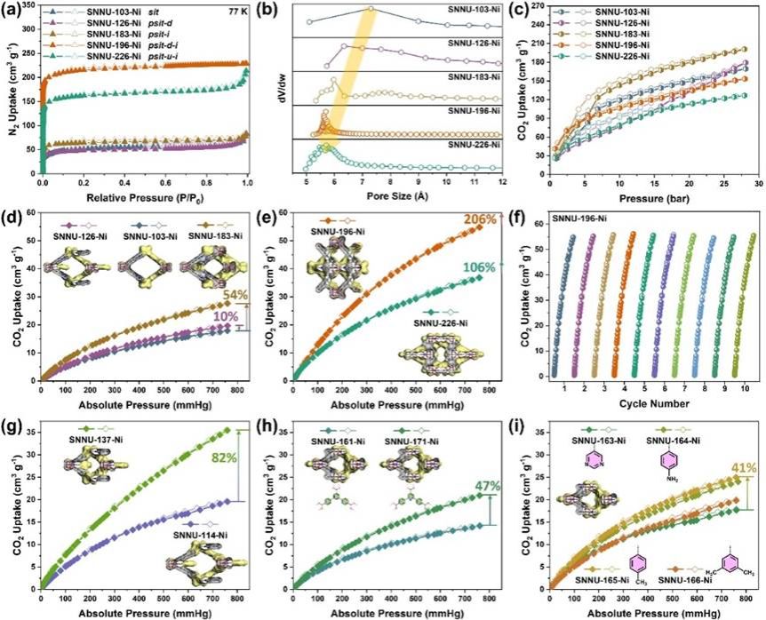 N2吸附测试表明,LGS-PSP策略显著优化了MOF的孔结构与CO2吸附性能。五例不同分区模式的代表性MOF均呈I型N2吸附等温线,比表面积和孔径随局部配体引入及穿插构筑显著变化,双重分区结构SNNU-196-Ni和SNNU-226-Ni的BET比表面积分别达829.9和631.1 m2 g-1,孔径约5.7 Å。SNNU-196-Ni的CO2吸附量在298 K和1 bar下相较母体框架提升206%,进一步通过调节配体取向、孔径大小及取代基类型等,可实现多尺度的CO2吸附性能优化。